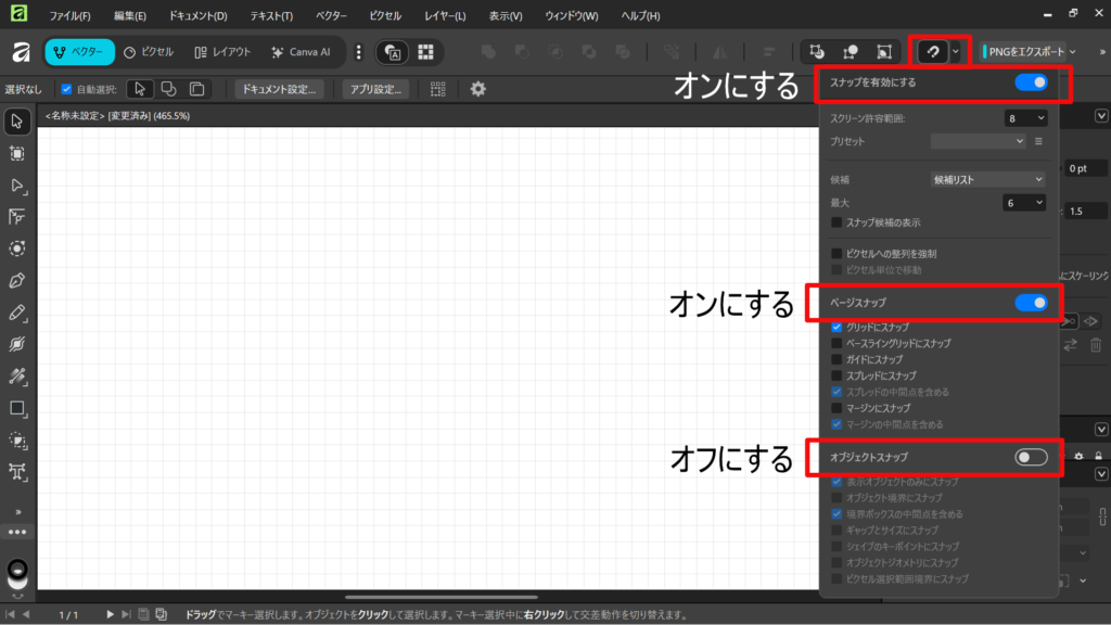 ③スナップ設定の調整 上部メニューにある磁石のマーク(スナップ機能)を開き、「グリッドにスナップ」をオン、「オブジェクトにスナップ」をオフにします。これで、線や図形が5mm方眼にピタッと吸い付くようになります。