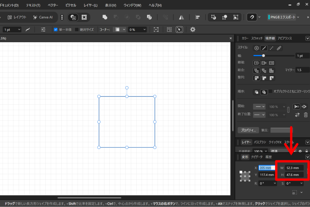 ⑤5mmの四角形ベースを作る 長方形ツールで、グリッドに合わせて5mm角の四角形を作ります。適当に四角形を配置した後に、右下の変形パネルにW=5mm,H=5mmと打ち込みます。また、このオブジェクトは線と塗りの情報を透明に設定します。これを編み目1つ分のマスになります。