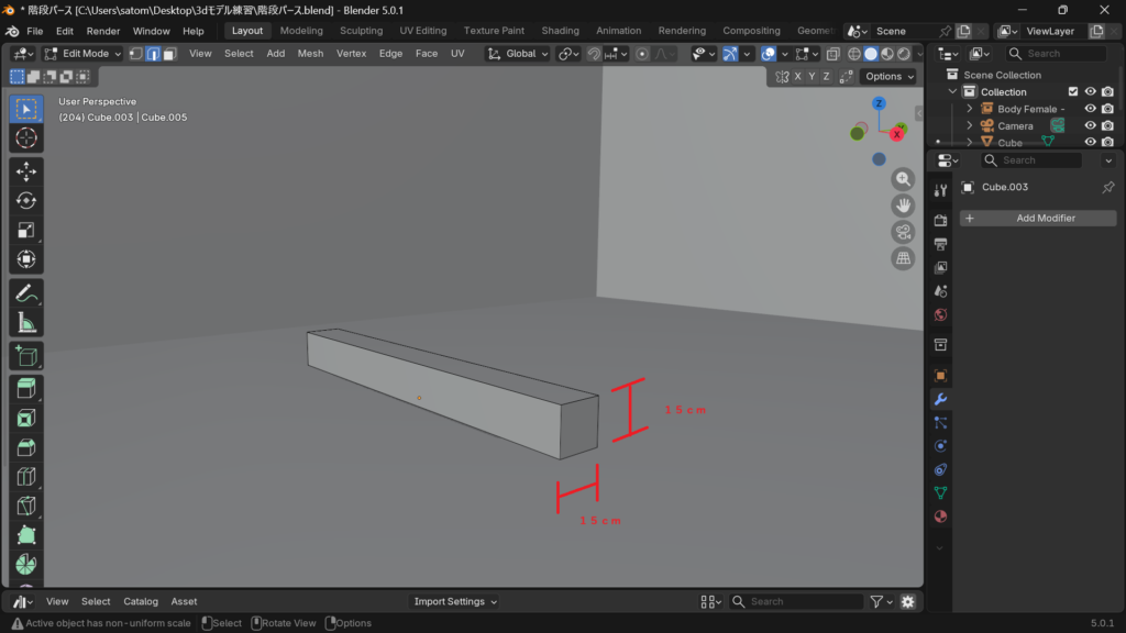 階段はarray(配列)が便利です。Blenderはメートル単位になっているのでとりあえず「蹴上0.15m、幅1m、踏面0.15m」の箱を作ります