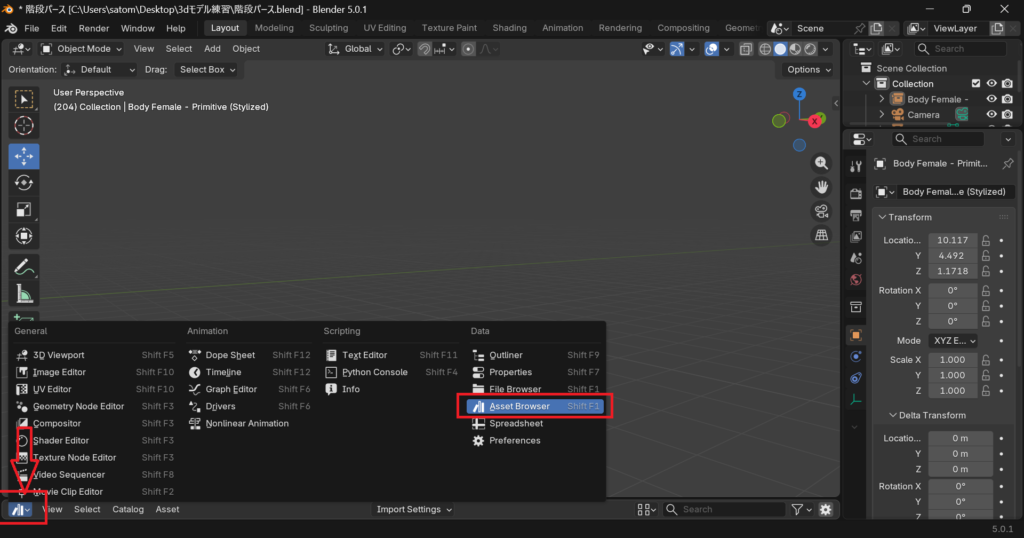 まず左下(赤枠)を選択し、アセット(asset browzer)を選択