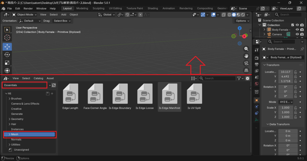 画面分割(赤線)を上にして、エッセンシャルに設定。メッシュの中をみます…が…ない!