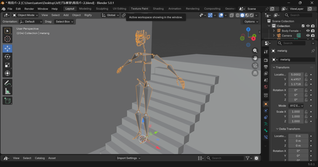 階段の作成、3D人形のインストールと配置、カメラの位置設定を行いました。3Dモデルはインストールさえできれば思ったより簡単に配置出来ました。好きなポーズに修正しようと思うと別のワザが要りそうです。次回Blenderの機能で線画を抽出してみようと思います。
