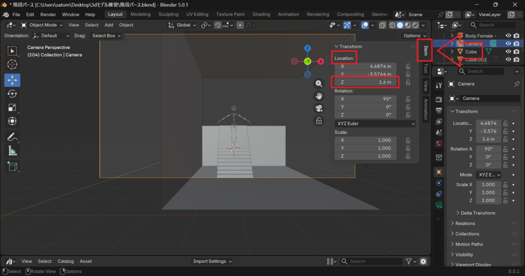 視点も1.6mのリアリティのある高さでパース作成に臨んでみます。カメラはshift+Aを追加し、そのあとNキーで右側に出るアイテムパネル(赤枠)からカメラのLocationをZ=1.6mに設定します。