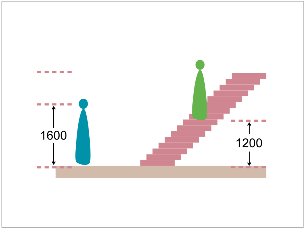 青が営業マン、緑が2階から降りてくる娘です。営業マンの視点の高さを1600mm、娘のいる場所を階段の真ん中としています。階段の1段の高さを150mmと設定、娘の立っている点は1200mmの高さと設定します。階段は16段あり、16段×150mmで2400mm上の2階にあがる階段という設定です