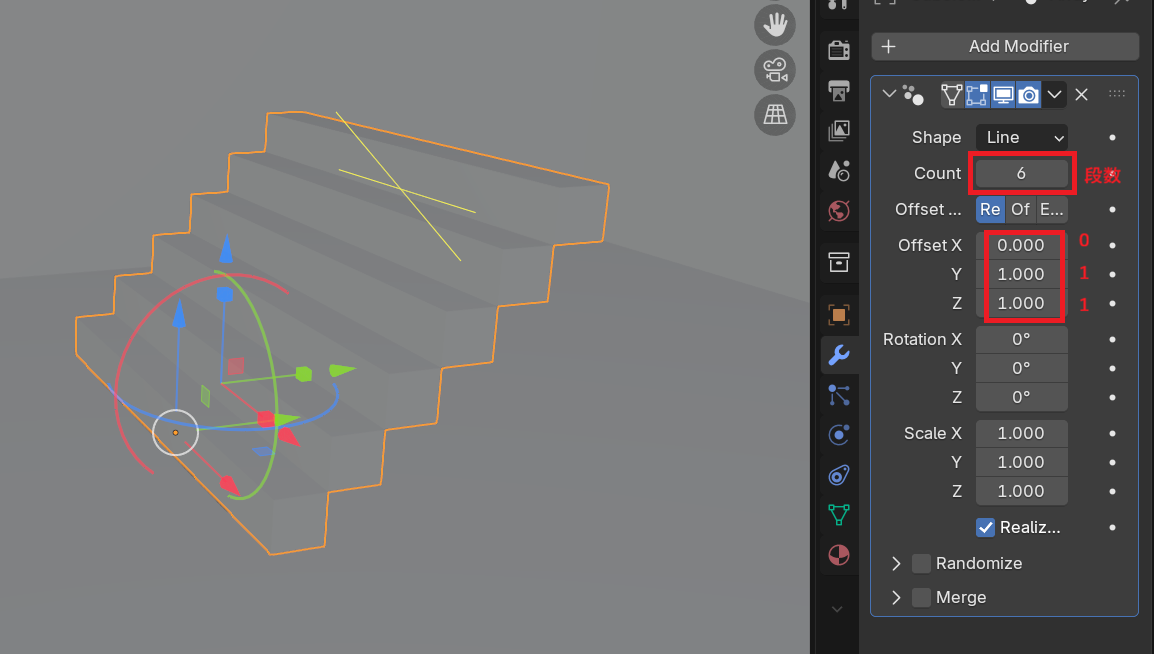 配列のモデファイアって横とか縦に複製するんじゃないの?って思っていたのですが、Z軸のオフセットに数値を入力すると、階段状のななめの配列を作ってくれます。あとは好きな段数にするだけ!