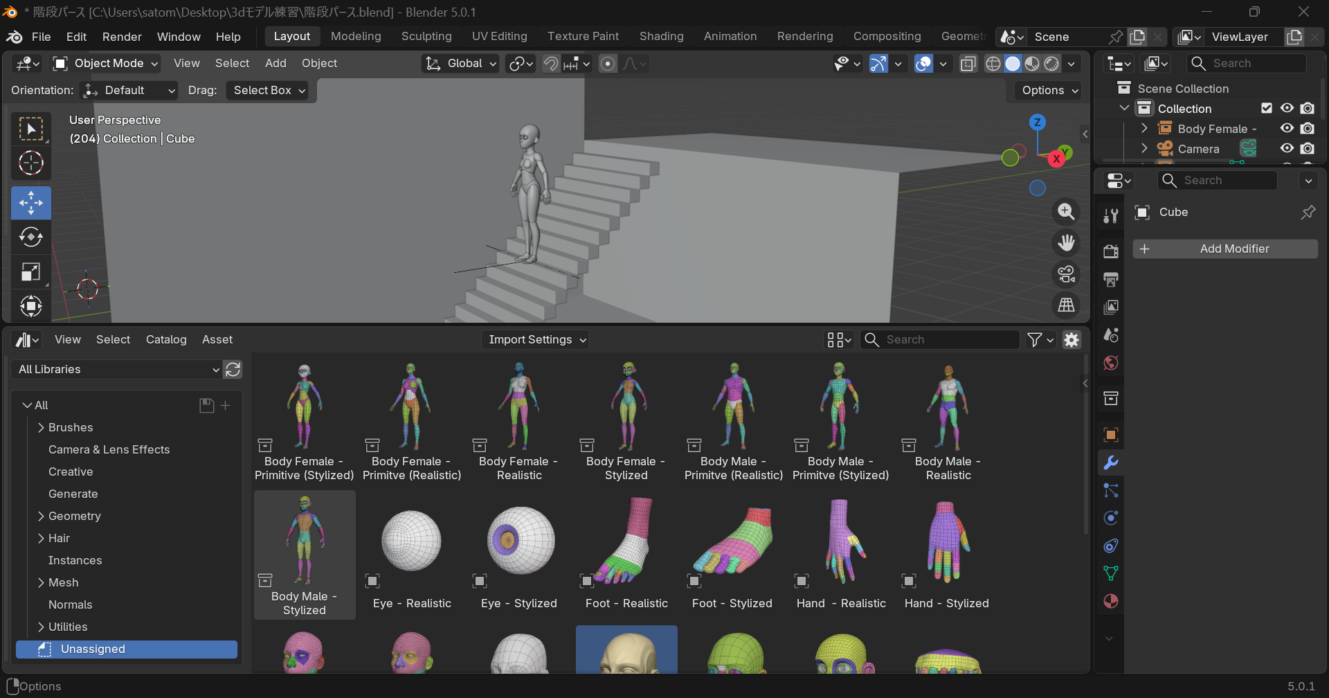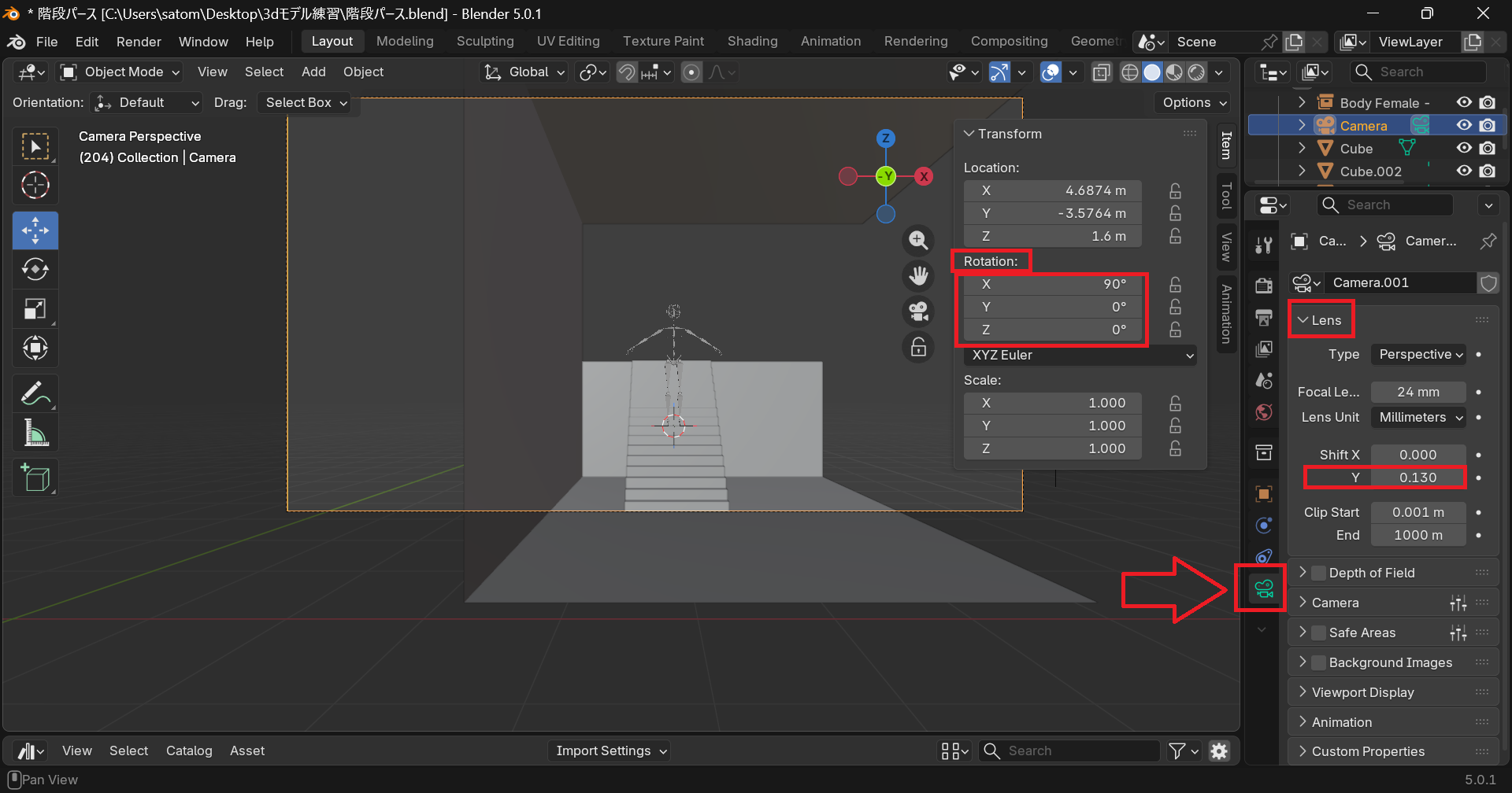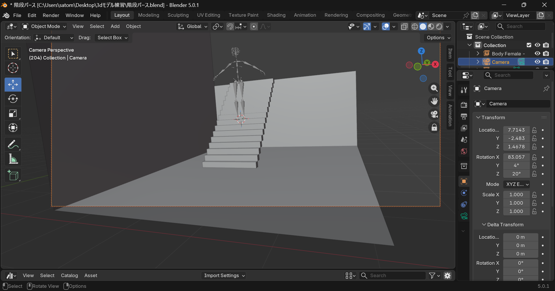 階段の作成3D人形のインストールと配置カメラの位置設定を行いました。3Dモデルはインストールさえできれば思ったより簡単に配置出来ました。好きなポーズに修正しようと思うと別のワザが要りそうです。次回Blenderの機能で線画を抽出してみようと思います。