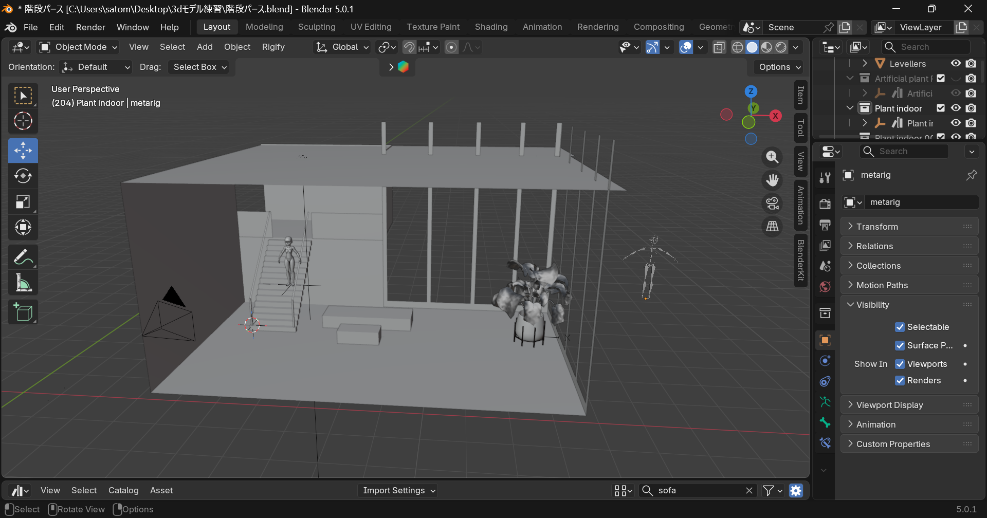 前回、階段や3D人形の配置といった手順を進めました。3D人形(human hush)を公式から無事インストールし、アセットに投げ入れてホッとしたのが記憶に新しいです。実のところ人形以外にも3Dの素材データって沢山配布されているのでしょうが、(それこそ今回作ったようなリビングデータも多分探せばもっとリッチなものがあります(笑))まだ初めて2か月程…練習を兼ねて自前で作ってみています