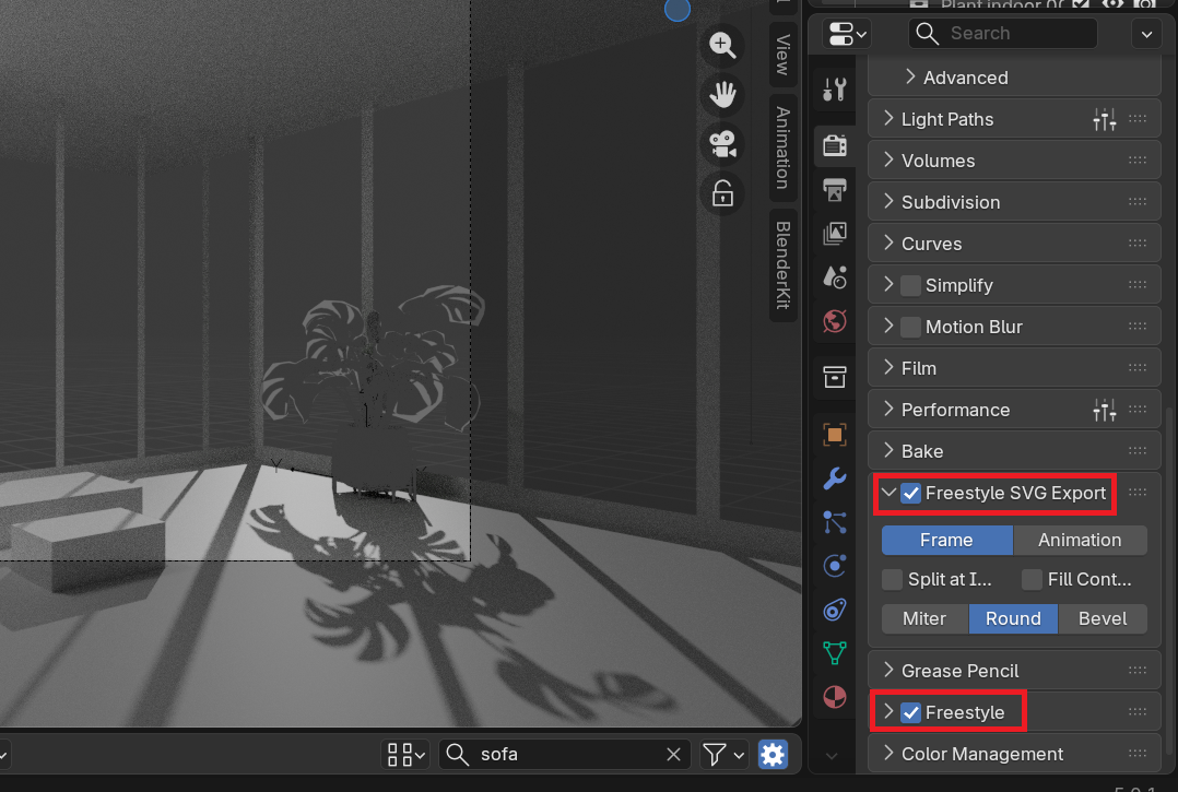 3Dからベクター線を出したいとき、絶対に必要なエクステンションが「Freestyle SVG Exporter」です。まずこのエクステンションをインストールすることから始めました。いつものように Edit → Preferences→Get Extensionsです。インストールできると、右のレンダープロパティにfreestyleのチェックボックスが2個出現します。2個ともチェックを入れ、レンダー(F12)!