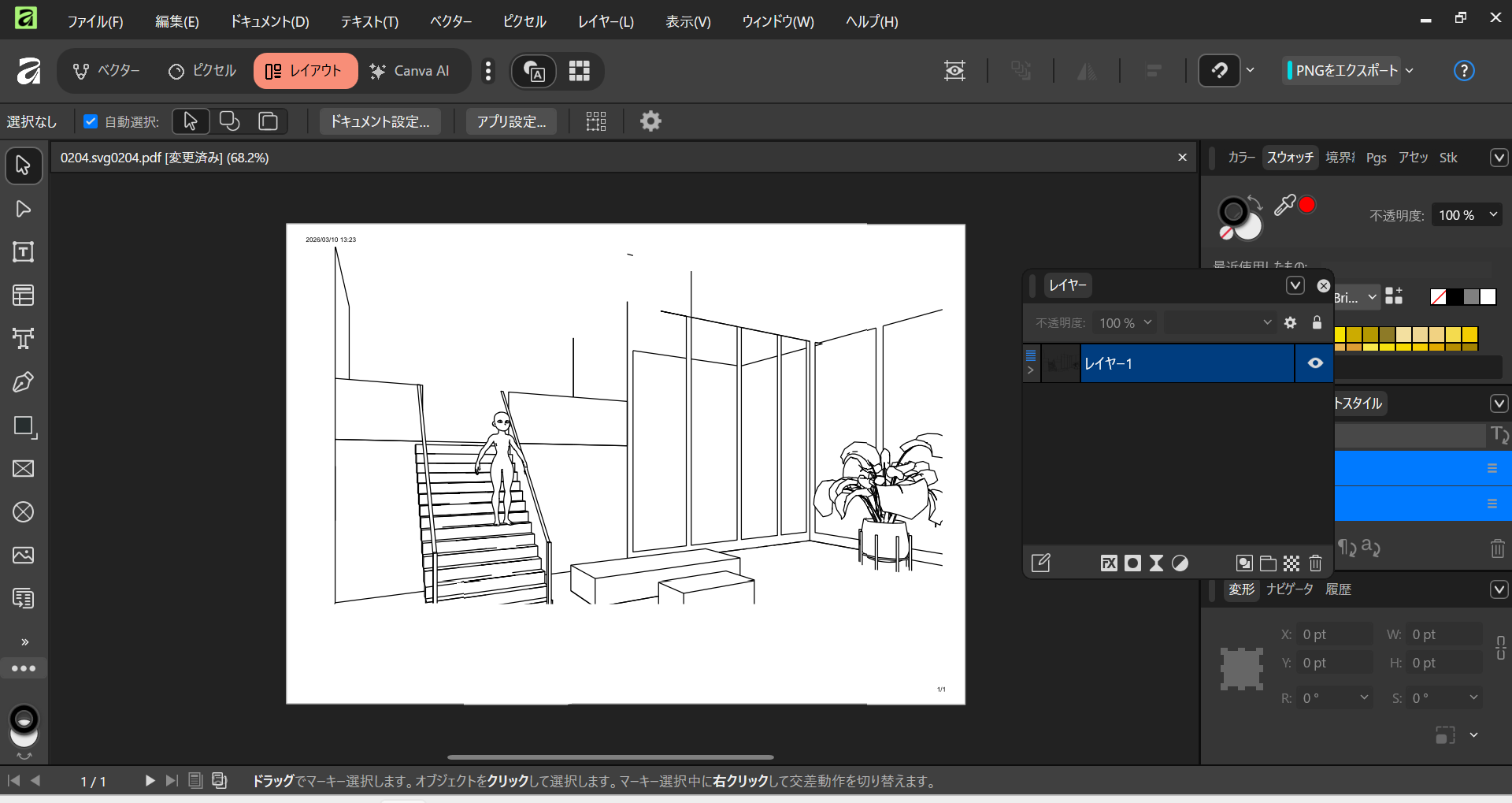 で、Blenderのfreestileで出したSVGデータをaffinityで開こうとしたところ上手く開けませんでした。ベクターデータ担当・筆頭Affinityで開けないと、「君で開けなければ、イラレ買うしかなくなるんだぞ!」と一瞬焦りましたが、一度chromeで開いてPDFデータに変換後、affinityで読ませるという手順を踏んだら開けました