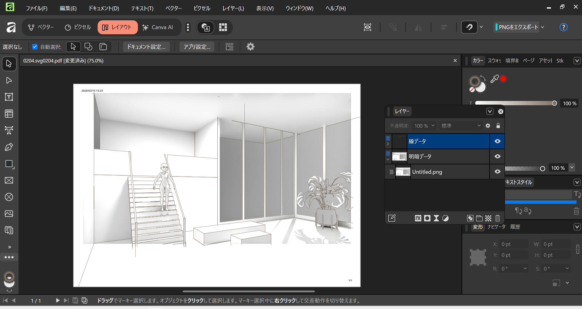 Affinity上で線データの色と太さを変更、明暗の露出を上げる