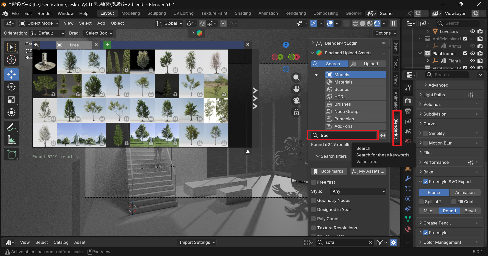 ちなみに無料のもありますが、今回初めて触った印象、有料のモデル多いな~って思いました!今回は無料の観葉植物を探して配置しました