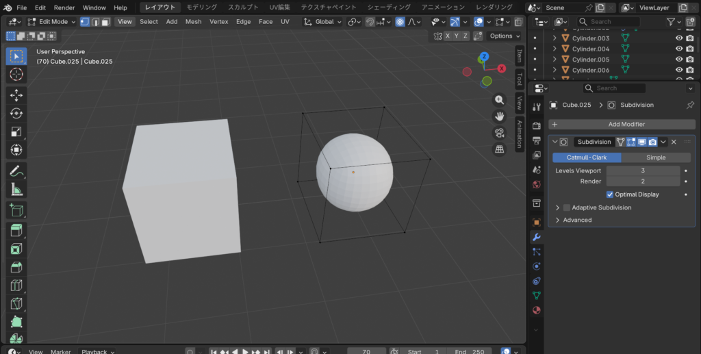 左の立方体にサブティビ(レベル3)をかけるとこのように変形します。設定はプロパティパネルの青いスパナマークから追加→生成→サブディビを選んで追加します