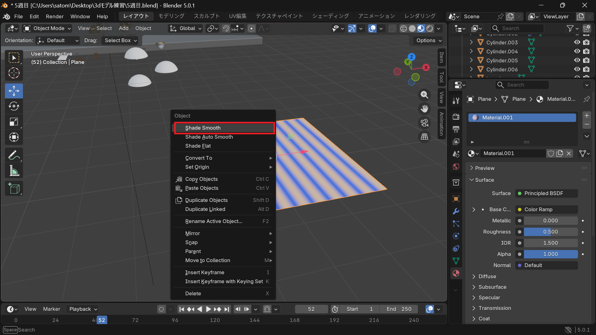 ②スムーズシェイドは「オブジェクトモード」で右クリック→メニューの一番上ですが一方、③細分化は「編集モード」で右クリック→メニューの一番上というように手順が似ているので混同しがちです