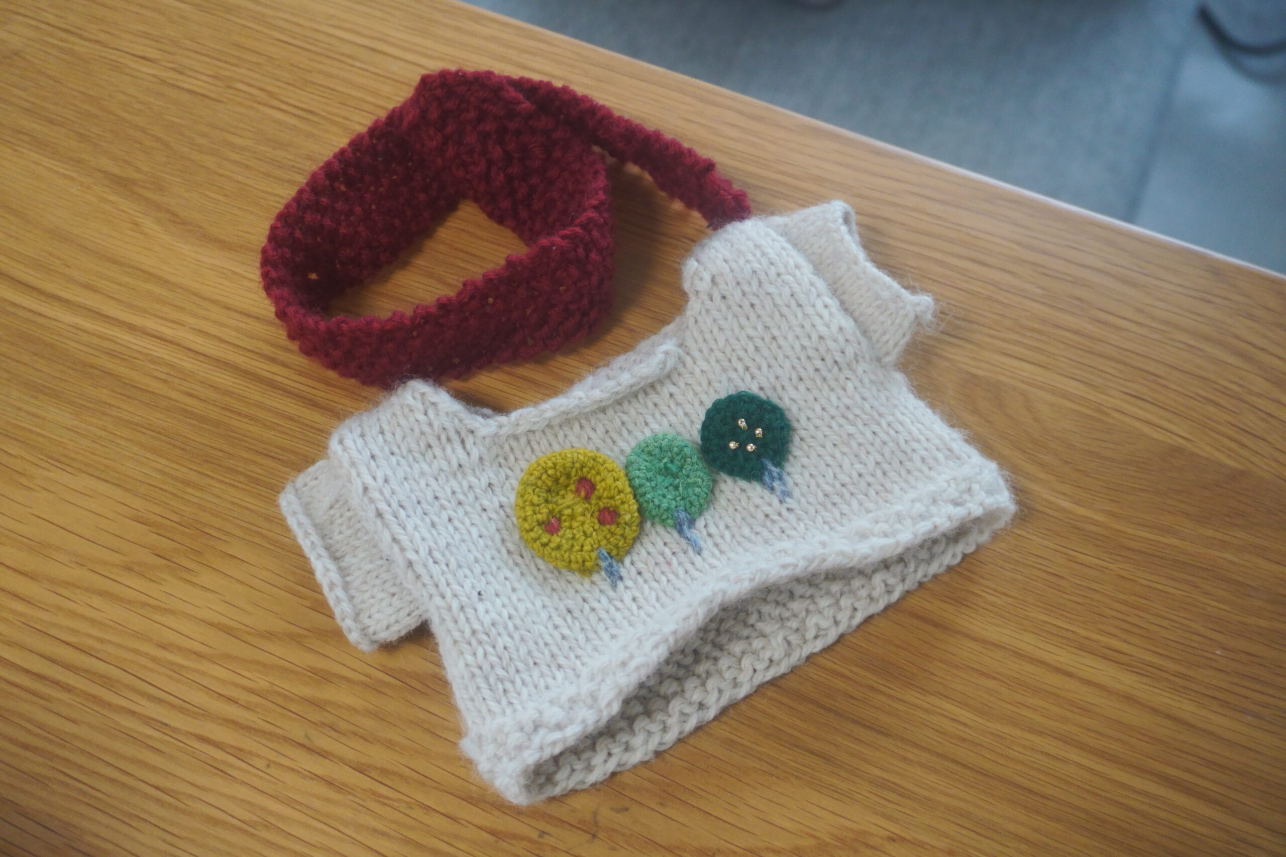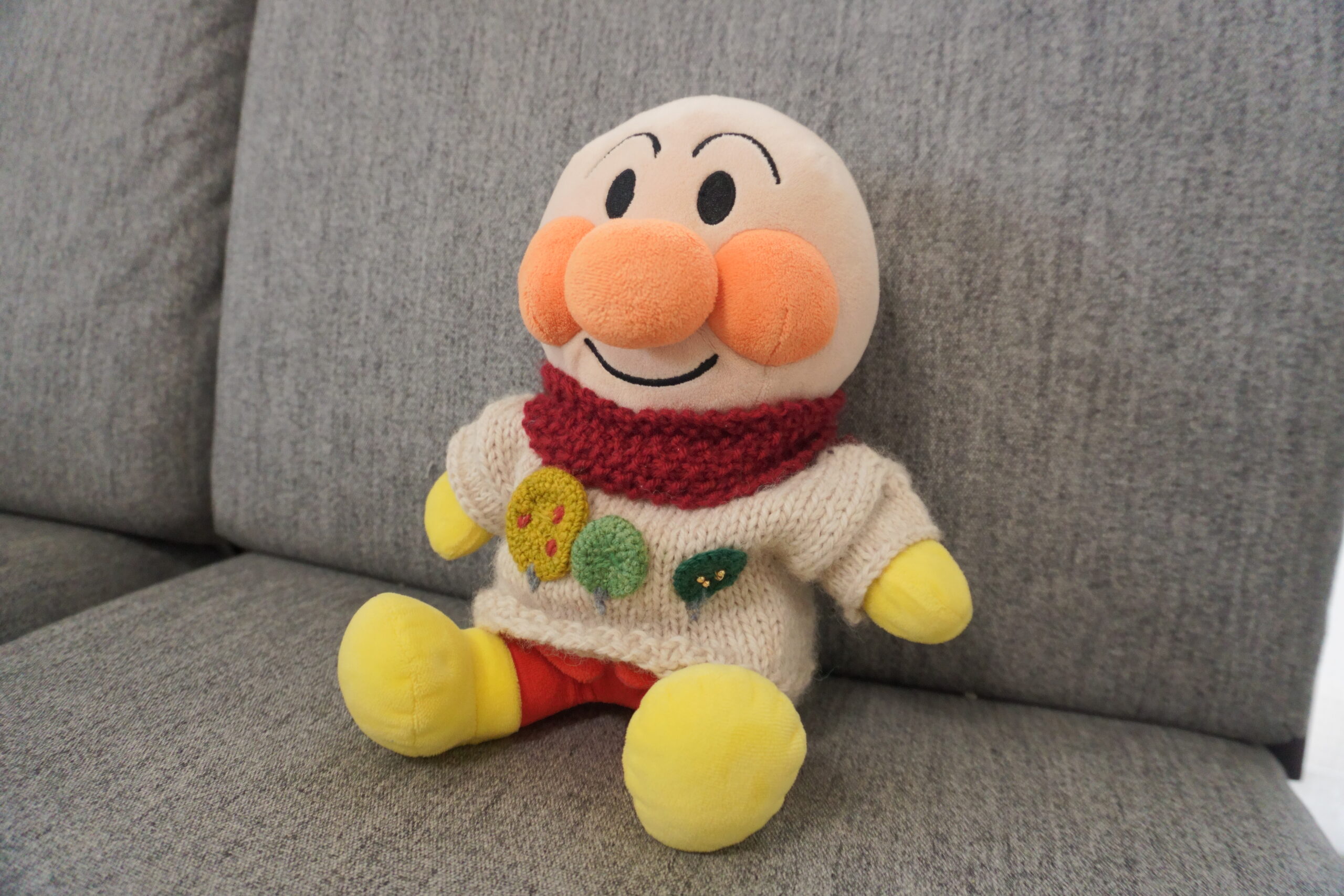 おまけにちょっと番外編。大好きなブリティッシュエロイカが中途半端に余ったので、娘のアンパンマン(ぬいぐるみ)にセーターを編んであげました!これは、計算度外視の「野性の勘」頼みの編み物…